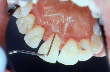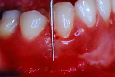 Please remember from 2. The Cause of Gum Disease, when the gums are infected, they detach from the teeth and form the probing depths that are deeper than 3 millimeters. The following case types will show probing being done and you will see the silver periodontal probbe. Healthy gums look healthy and probing into the "ditch" or "sulcus" only goes to a depth of 1-3 millimeters. Disease gums show changes in color, form and texture, and also show a probing depth deeper than 3 millimeters.